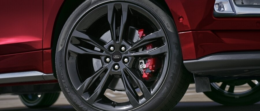 21-inch premium gloss black-painted aluminum wheels, showing the available painted Colorado Red brake calipers.